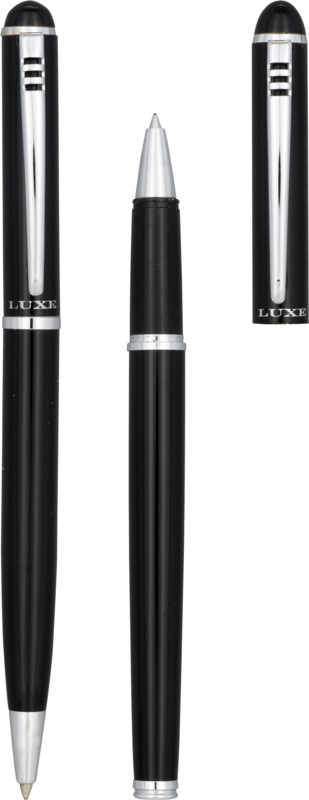 This Andante duo pen set offers a sophisticated writing instrument pairing for corporate gifting. It includes a twist ballpoint and a cap-type rollerball pen, both with black ink. Presented in a “Luxe” gift box, it helps enhance your brand image.