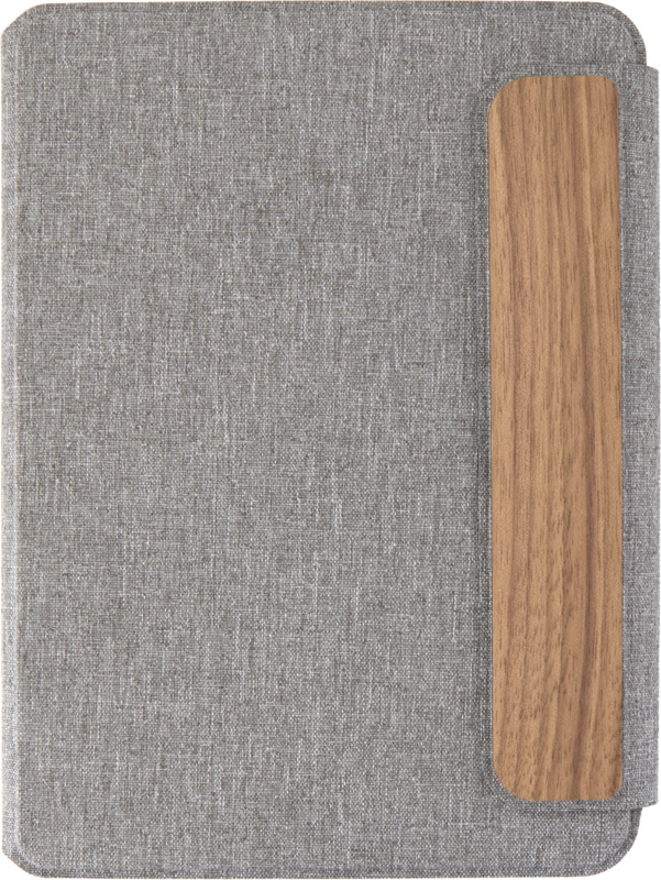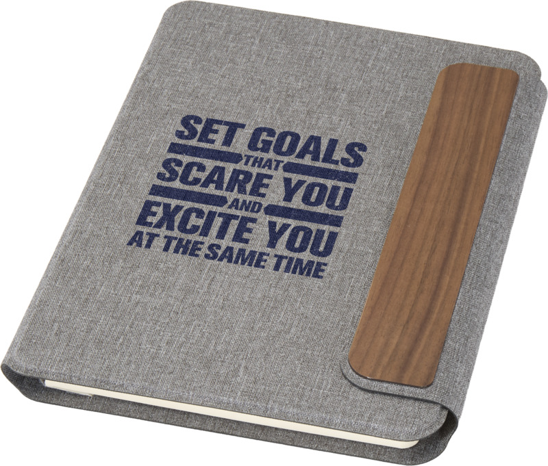 This practical A5 portfolio, partly made from RCS recycled polyester, offers a sustainable option for promotions. It includes a removable softcover notebook and features a grey hard cover with a magnetic closure and walnut wood detail. Provide this item to clients and staff, reflecting your brand’s careful approach.