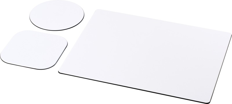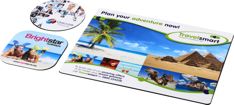 Display your brand daily with this Brite-Mat® mouse mat and coaster set. It offers a rectangular mouse mat (19 x 21cm) and two matching coasters, one square and one round. This practical combo provides constant brand visibility for your promotional campaigns.