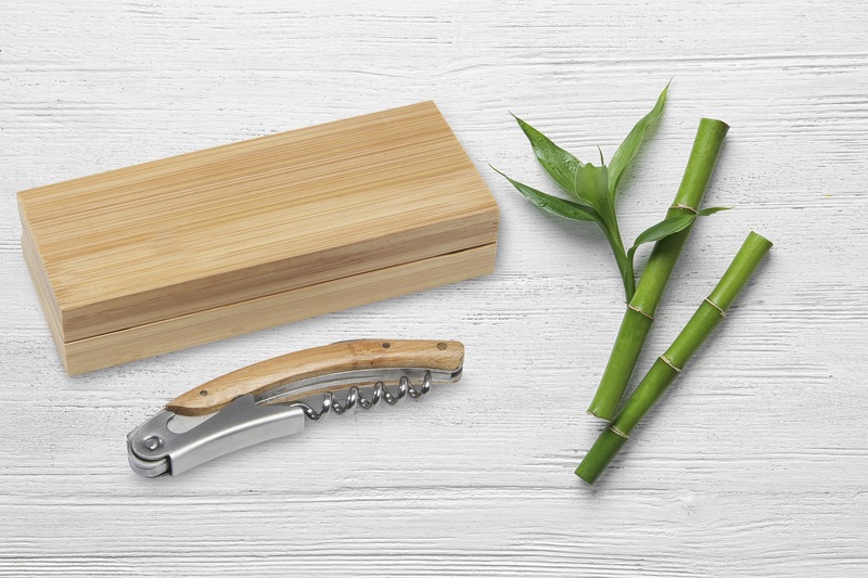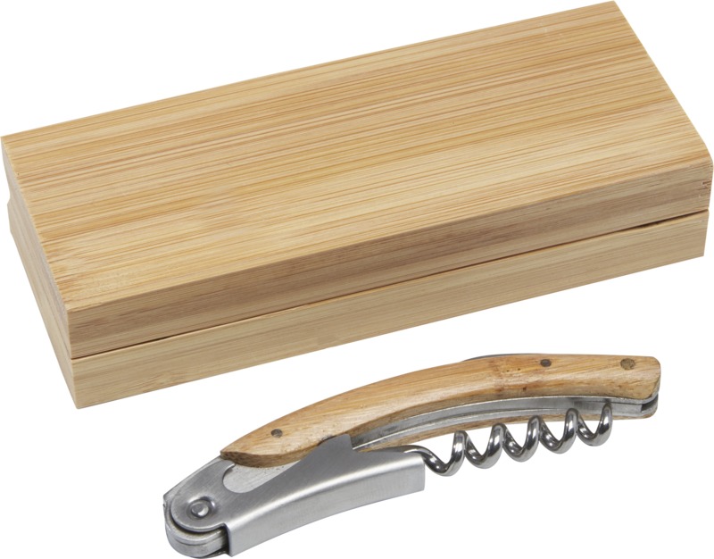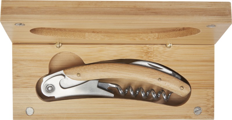 This durable Carmenier waitress knife helps open wine bottles with ease. It features a stainless steel corkscrew and a retractable foil knife. The natural bamboo handle makes it a practical item for promotional branding, especially for hospitality businesses.
