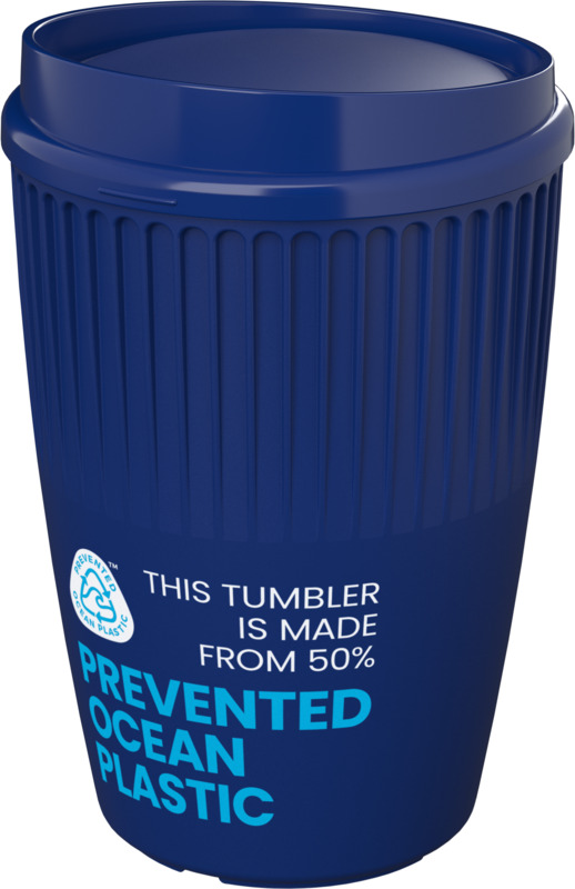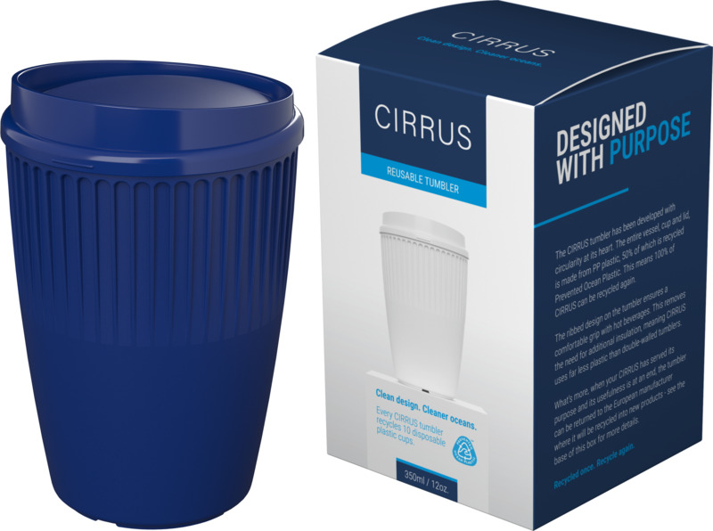 The Cirrus POP 350 ml tumbler is an environmentally aware item, made with 50% Prevented Ocean Plastic. It reuses five plastic cups. Its single-walled design includes insulating ridges for comfortable holding and a practical clip-on lid. This tumbler makes a good choice for brand campaigns.