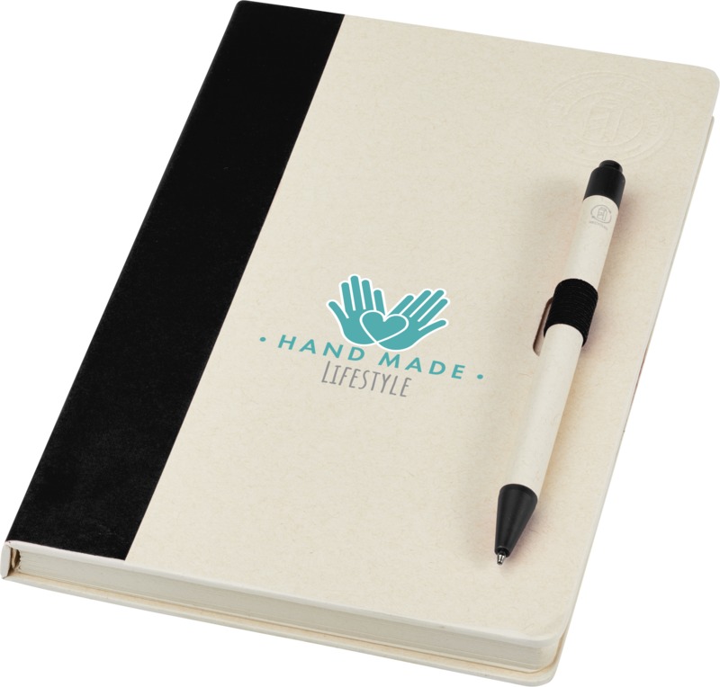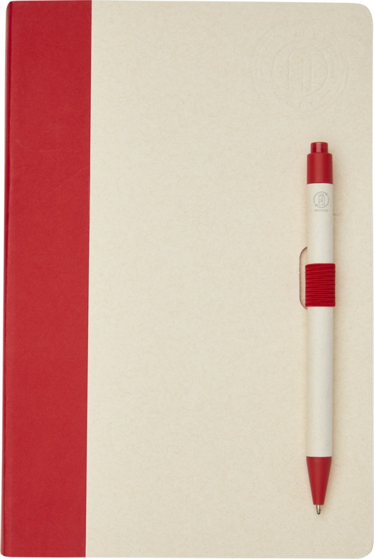 The Dairy Dream A5 size reference recycled milk cartons notebook and ballpoint pen set is an excellent choice for general promotional use, providing a practical and environmentally aware item.