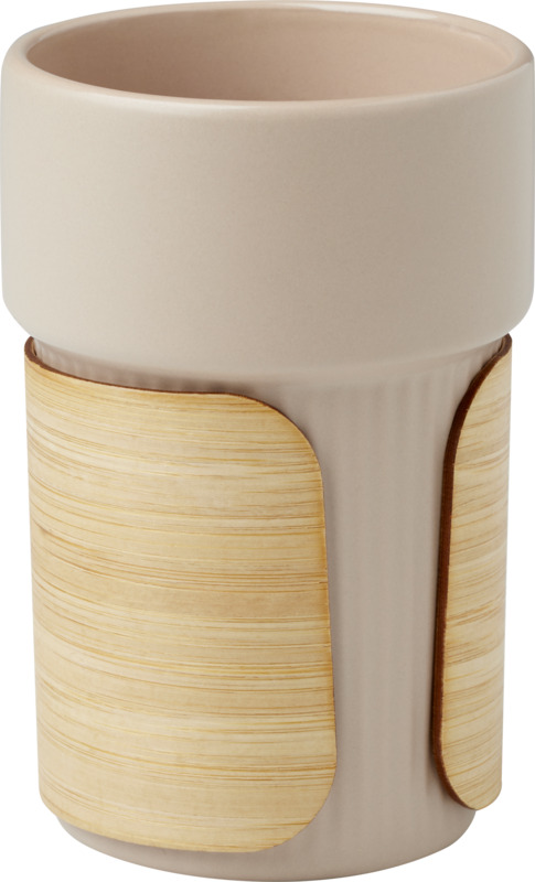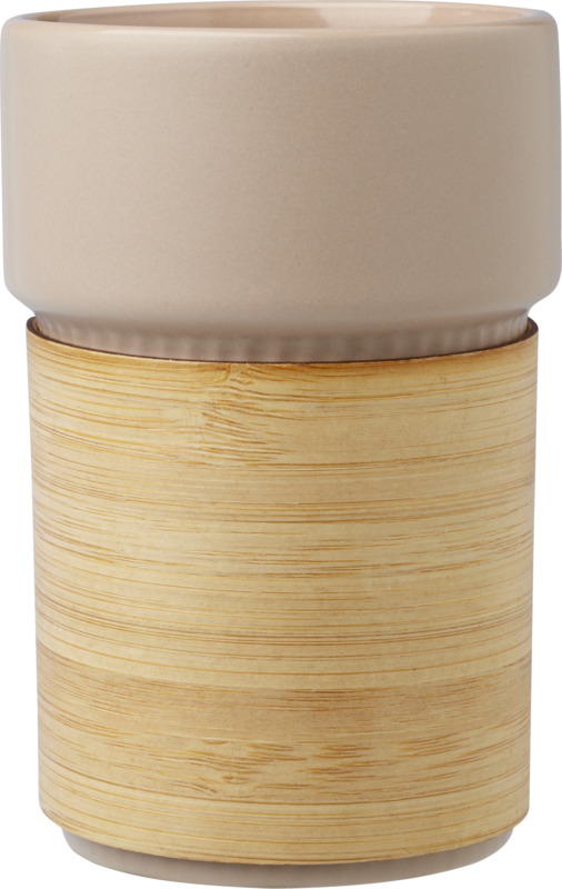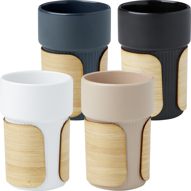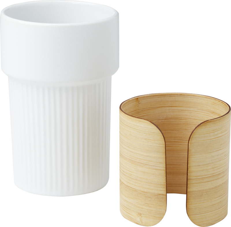 The Fika 340 ml ceramic tumbler is a practical branded gift for clients or staff. It features a removable, sustainable bamboo sleeve, good for handling hot beverages. This item helps promote your brand effectively.