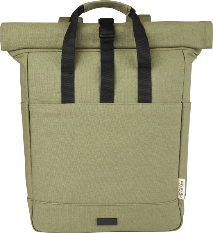 The Joey 15” GRS recycled canvas rolltop laptop backpack is an excellent choice for general promotional efforts, offering a sustainable and practical item for your brand.