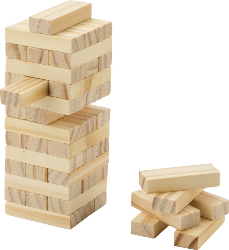 • A classic block-stacking game, made from wood, where players remove and stack blocks without the tower falling.