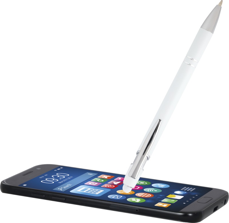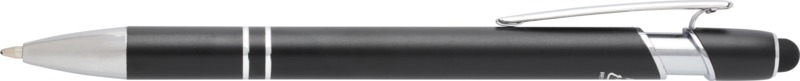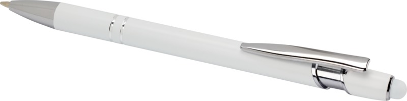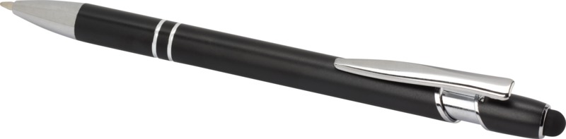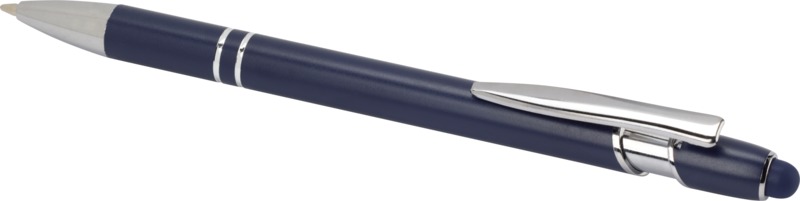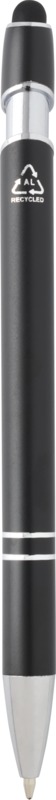Promote your brand with the Kish ballpoint pen, an environmentally aware writing tool. It features a recycled aluminium barrel and a silicone touch stylus for screen interaction. This pen writes smoothly with blue ink, making it a practical choice for your promotional needs.