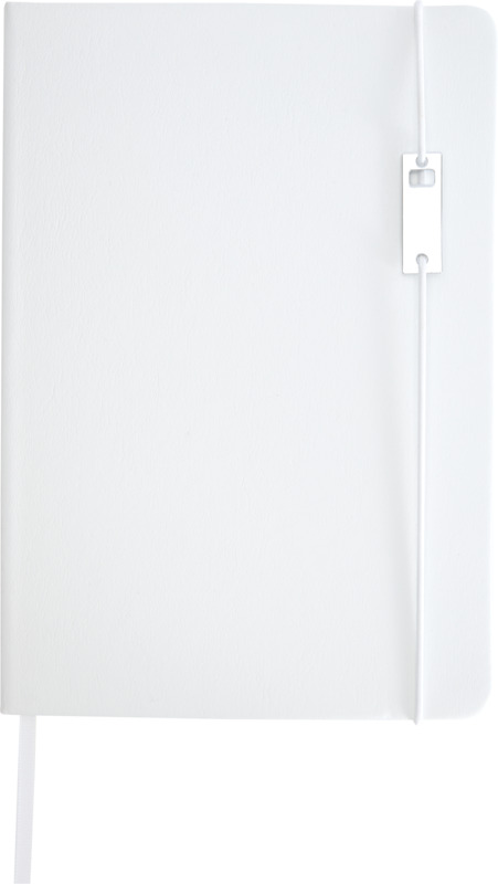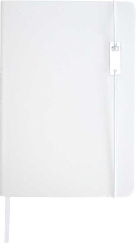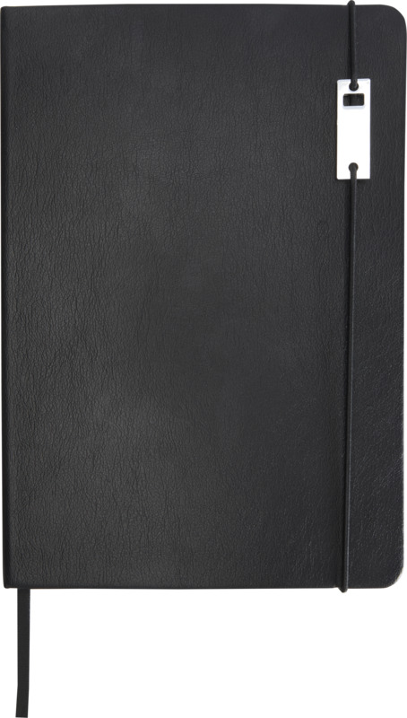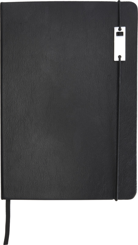 • The notebook has a recycled leather-like plastic cover, an elastic closure with a silver chromed metal accessory, a ribbon marker, and an accordion pocket.