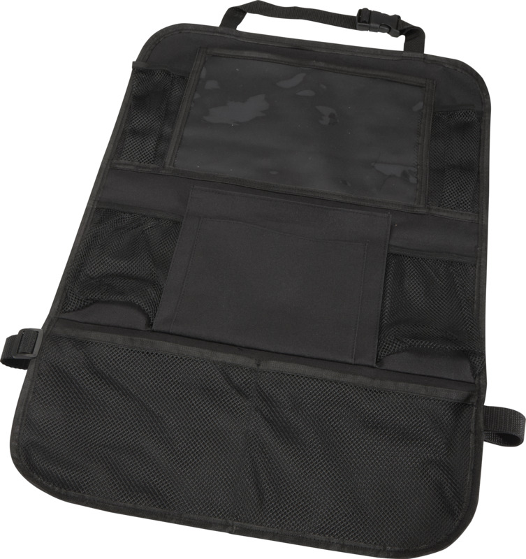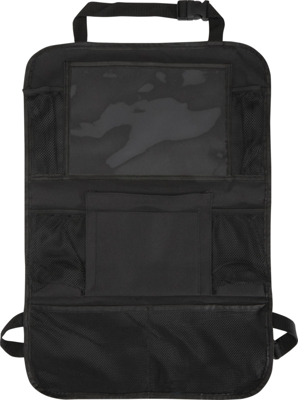 This Lex car back seat organiser helps keep vehicles neat. It has multiple mesh pockets for storing snacks and toys, plus a clear PVC window to hold a tablet for entertainment. This practical item is suitable for general promotional campaigns.
