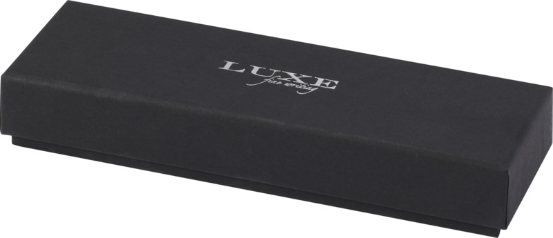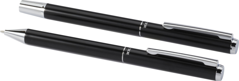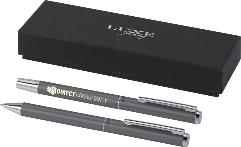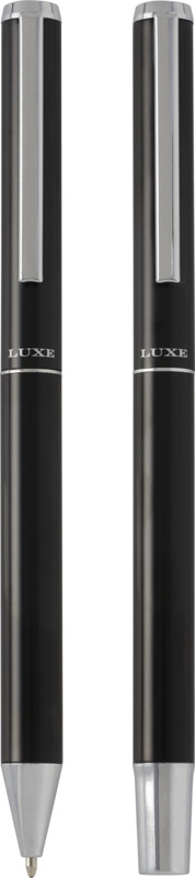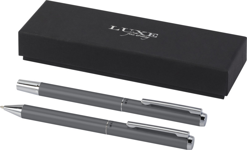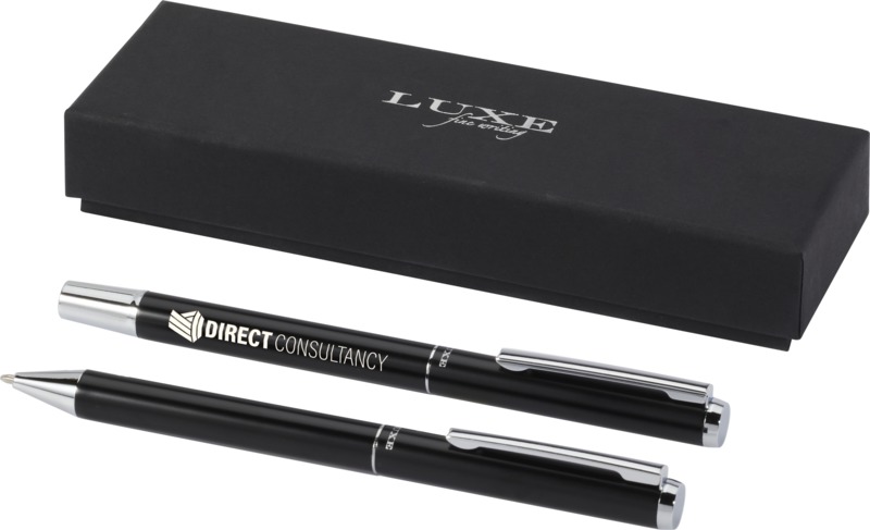 This Lucetto pen set offers a practical, more sustainable choice for promotions. It includes a ballpoint and rollerball pen, both with black ink and barrels made from recycled aluminium. The set comes in a black gift box, making it suitable for any brand.