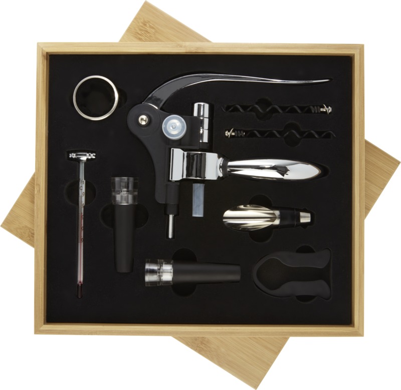 The Malbick 9-piece wine set is an excellent choice for general promotional campaigns. It features a corkscrew, two stoppers, a pourer, and a foil cutter. All items are presented in a sustainable bamboo gift box, representing the Malbick brand.