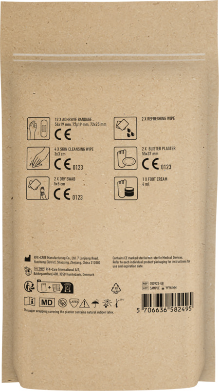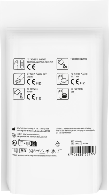 • The kit contains 12 wash proof plasters, 4 skin cleansing swabs, 2 refreshing wipes, 2 dry swabs, 2 blister plasters, and 1 foot gel.
