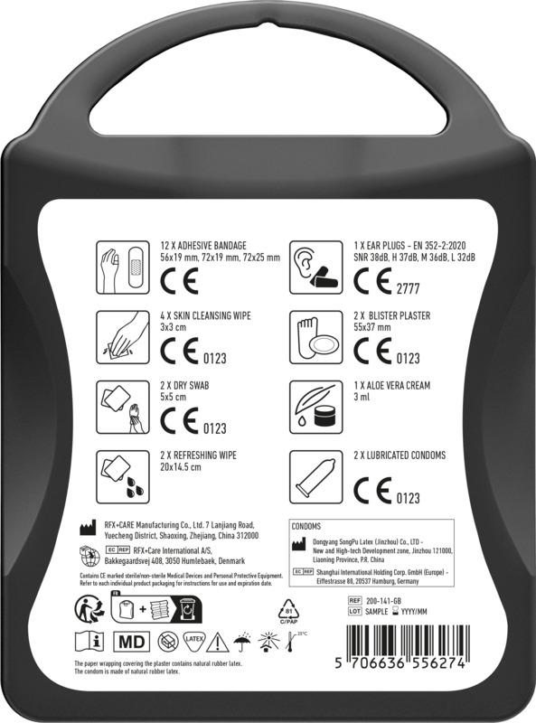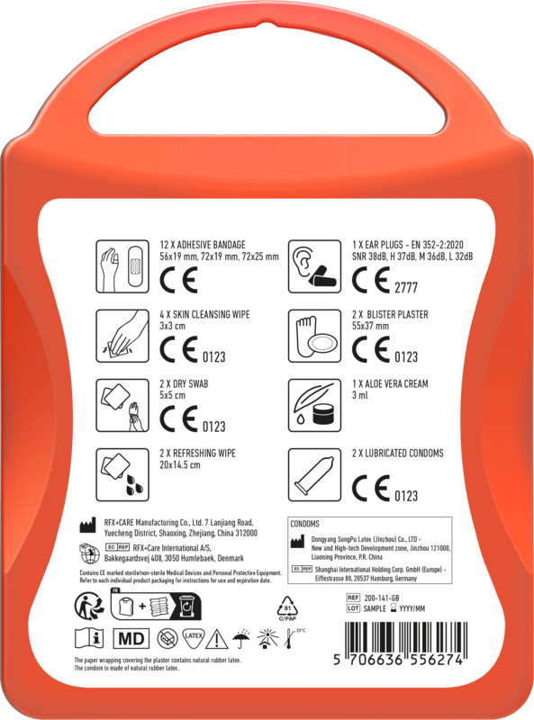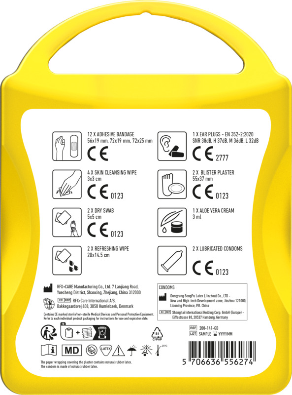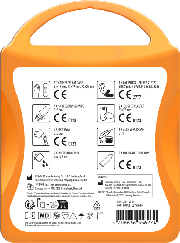 - All included first aid and care products comply with applicable EU regulations.