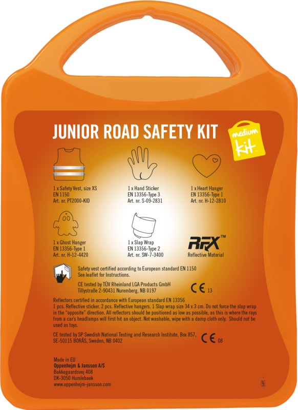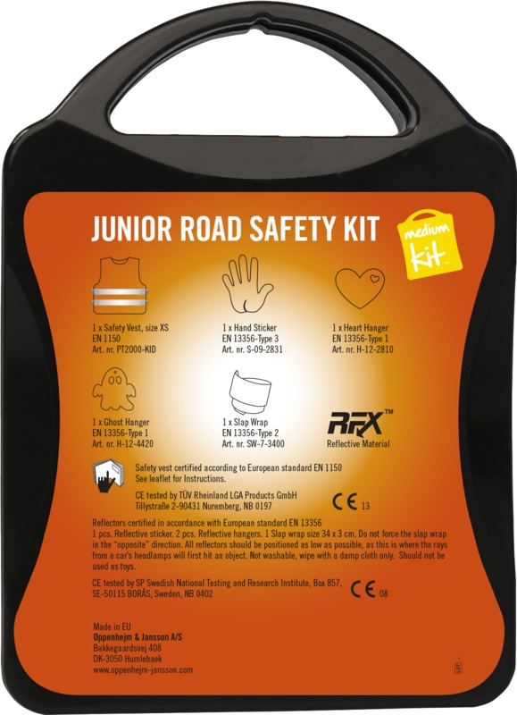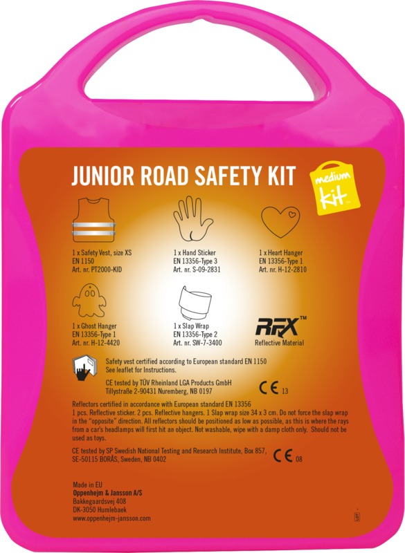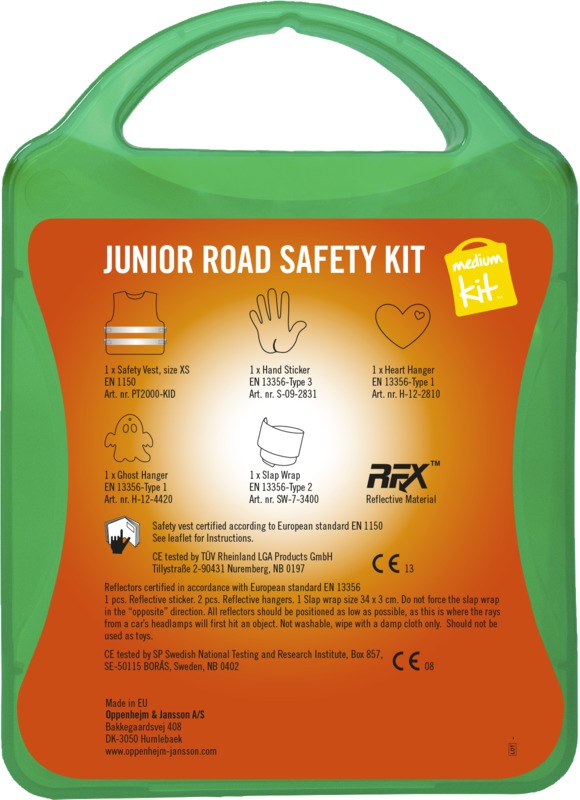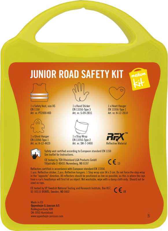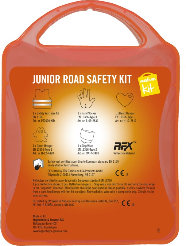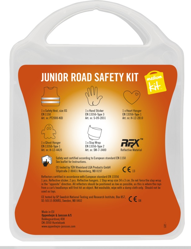 The MyKit M Junior Road Safety kit helps keep children visible and safe. It contains one safety vest, two slap wraps, and two reflective hangers for increased visibility. This kit offers a good item for general promotional campaigns.
