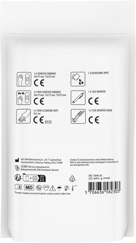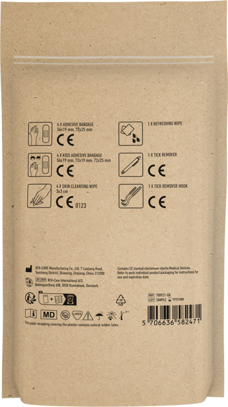 • This kit contains essential items: 4 wash proof plasters, 4 skin cleansing swabs, 1 blue tick remover for humans, 1 orange tick remover hook, 4 kid plasters, and 1 refreshing wipe.