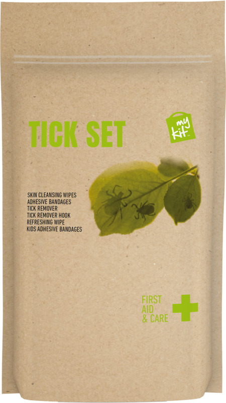 This MyKit Tick First Aid Kit helps with tick removal and bite treatment for both people and animals. It contains wash-proof plasters, skin cleansing swabs, and two tick removers. All items meet EU regulations. This useful kit is a practical promotional product for clients and staff.