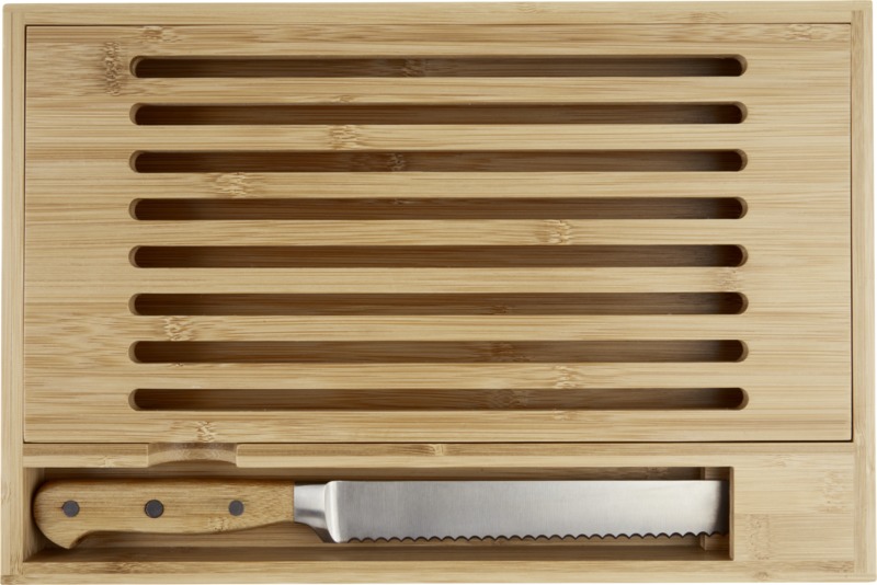 Keep your kitchen tidy with this Pao bamboo cutting board and knife set. The board’s open pattern catches crumbs into a tray, helping maintain a clean workspace. Both items are made from sustainably sourced bamboo, making this a practical promotional item for any kitchen.