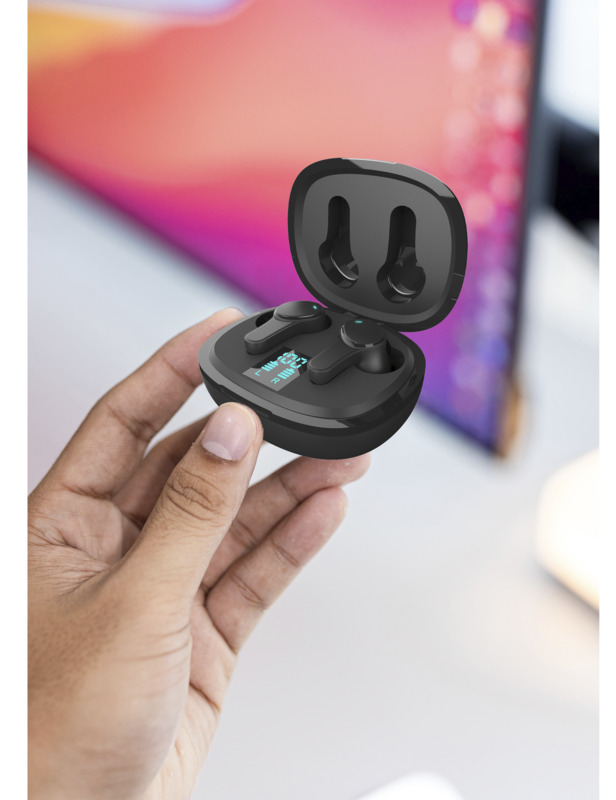 • The charging case can charge the earbuds up to 4 times on a single charge and has a small screen to show battery life.