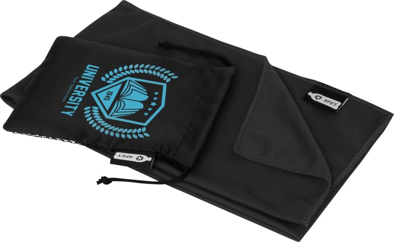 The Raquel cooling towel offers good branding space on both the pouch and the towel, making it a practical choice for promotional branding.