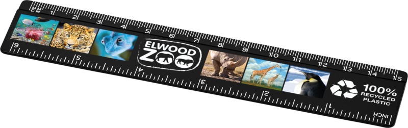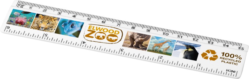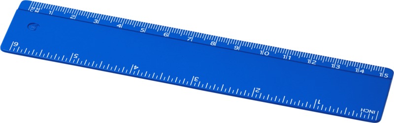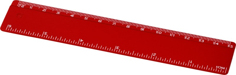 This Refari 15 cm ruler provides a practical desktop accessory for promotional use. It is made from solid recycled plastic and features clear markings for both inches and centimetres. This makes it a good branding item, offering daily visibility.