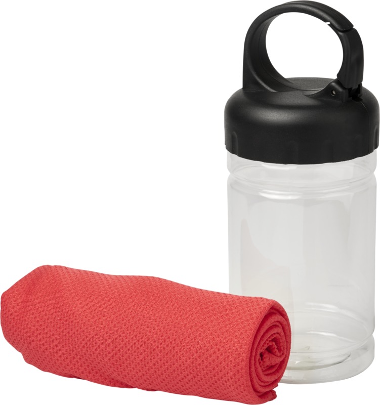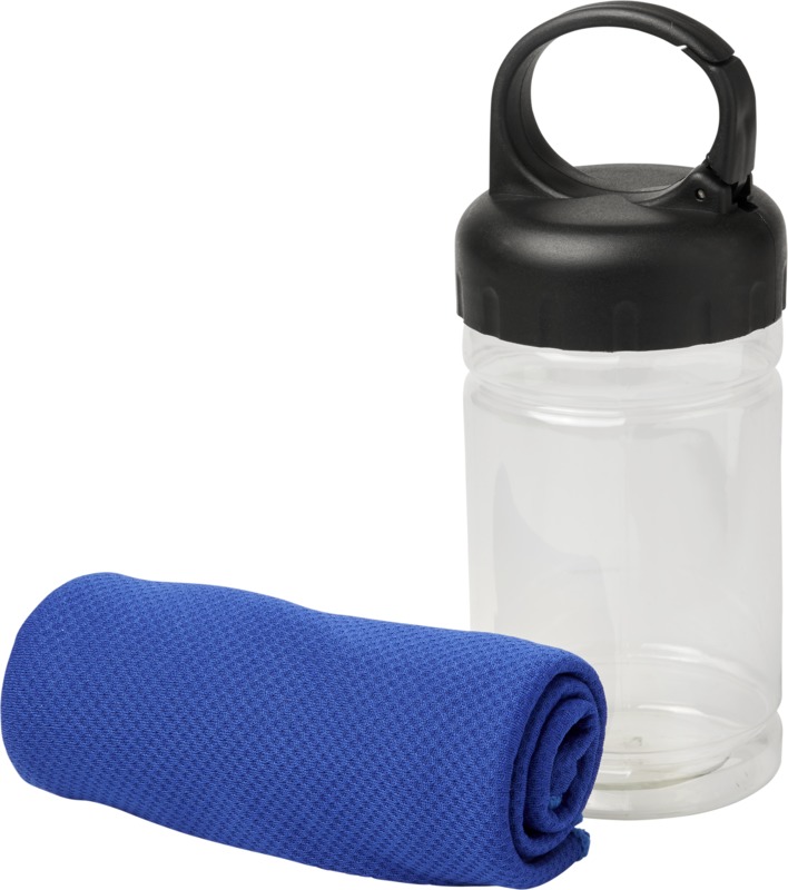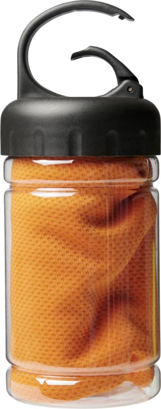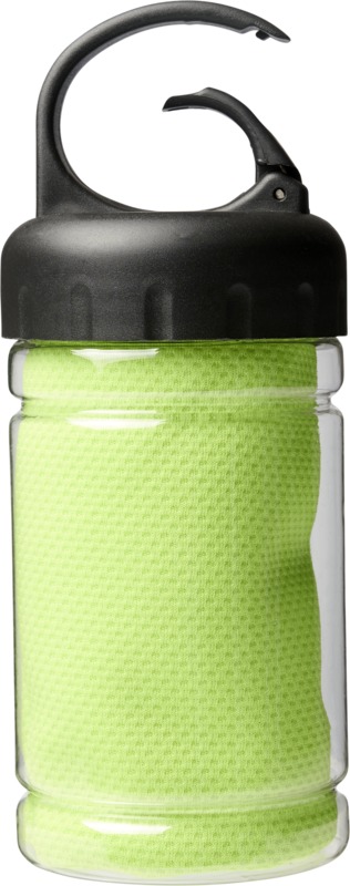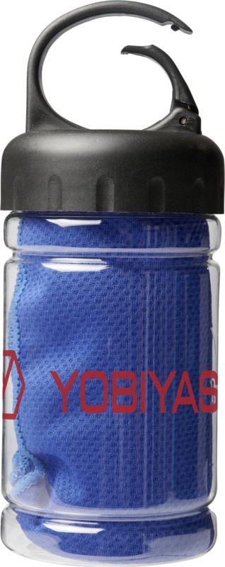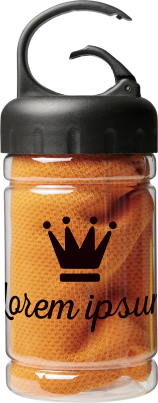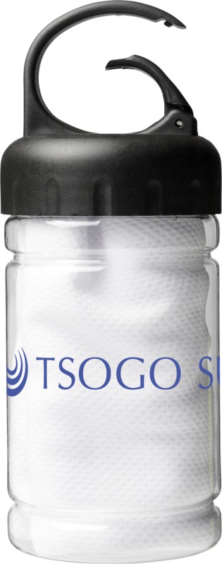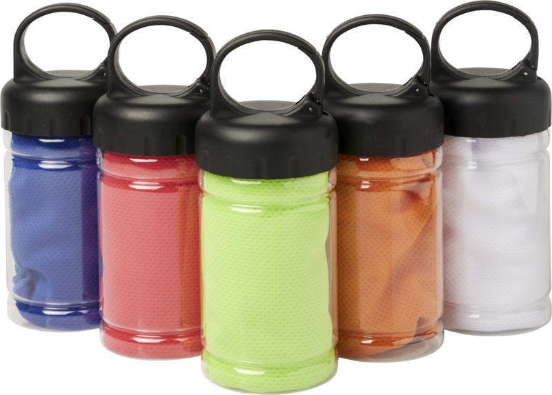This cooling towel offers good space for company branding on the container and the towel itself, making it a visible promotional gift.
