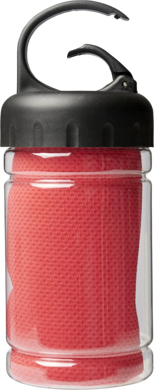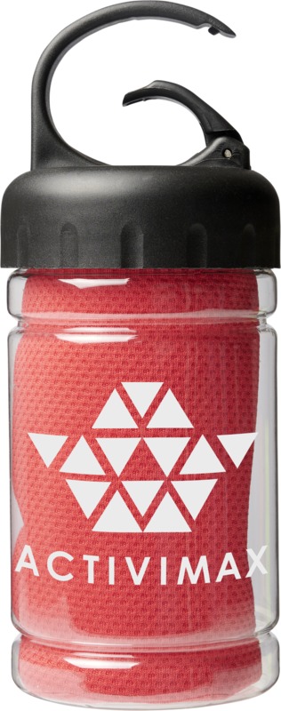 This Remy cooling towel helps users stay comfortable during physical activities. It is quick-absorbing, quick-drying polyester, measuring 30 x 80 cm. It comes in a PET container with a carry handle and carabiner, making it ideal for promotional campaigns.