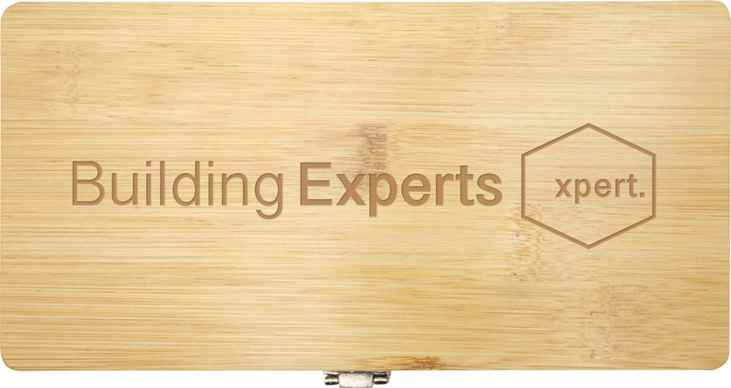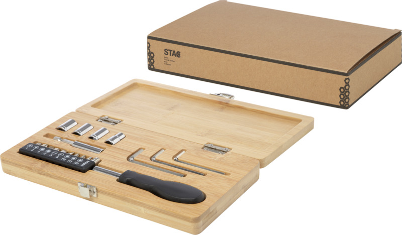 This Rivet 19-piece tool set makes a practical gift for clients or staff. It includes 19 carbon steel tools inside a case made from bamboo and recycled plastic. This set helps promote your brand responsibly.
