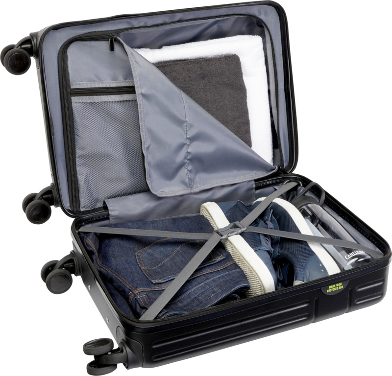 - Interior divider organiser compartments keep belongings tidy, and this 20-inch trolley is suitable as hand luggage on most airlines.