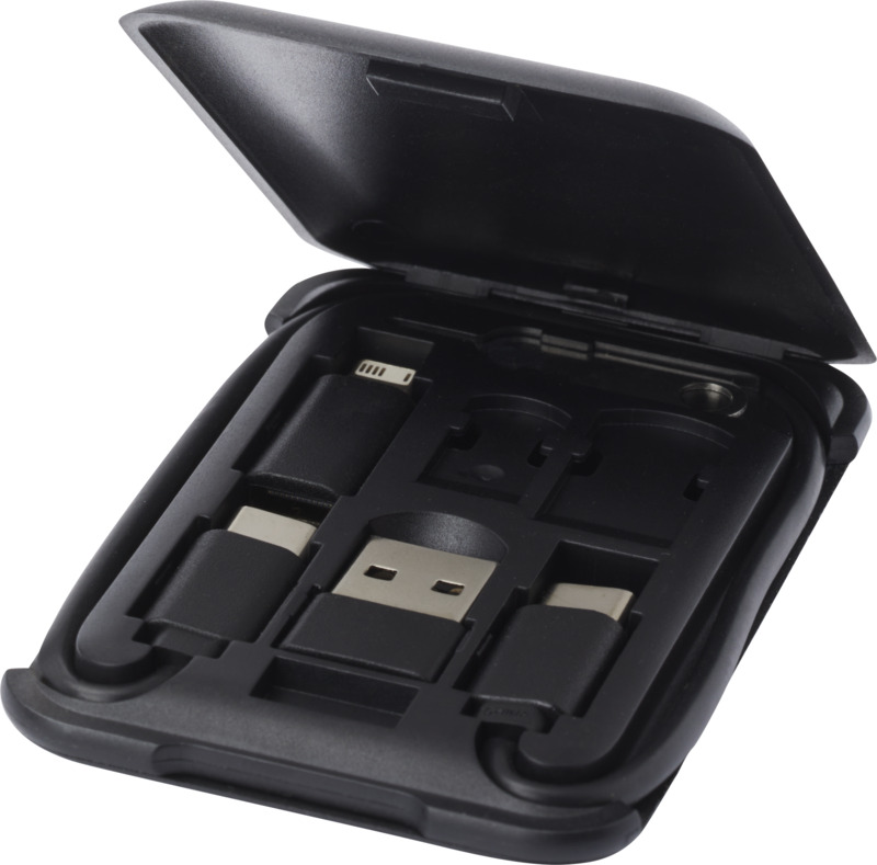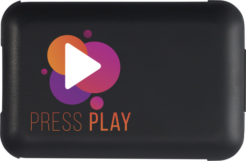 This Savvy recycled plastic modular charging cable charges most devices, including phones and cameras. It features a storage box that works as a phone stand. Made from recycled plastic, it is a practical choice for promotional use.