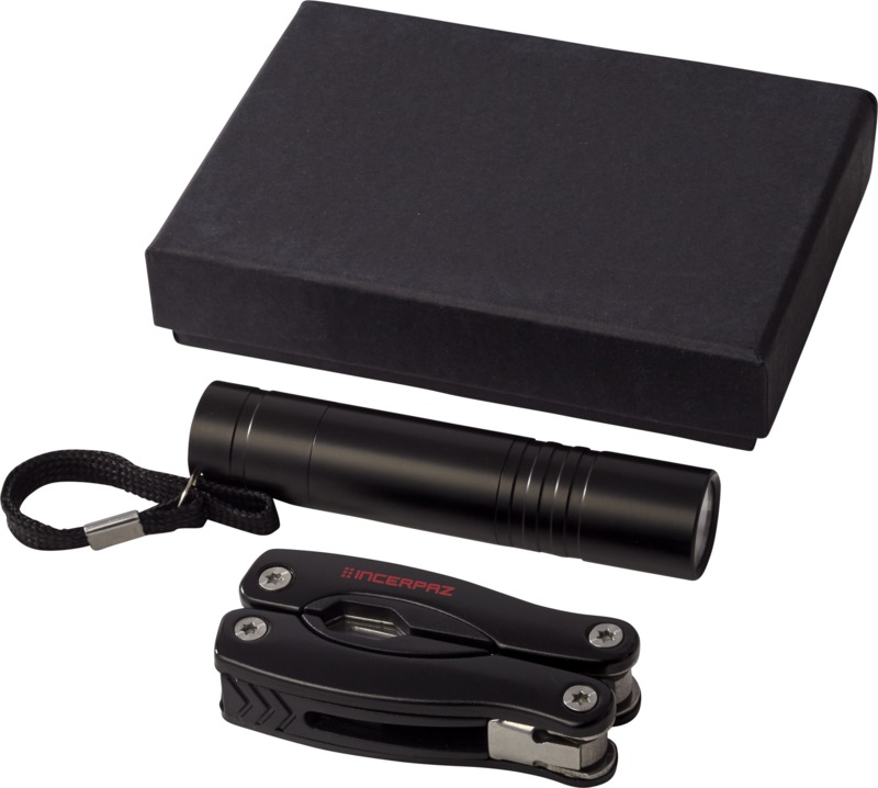 This Scout multi-function knife and LED flashlight set serves as a practical promotional item. It includes an 11-function mini multi-tool and an LED flashlight, with batteries supplied. Presented in a black gift box, this set is ready for use and suitable for various businesses.
