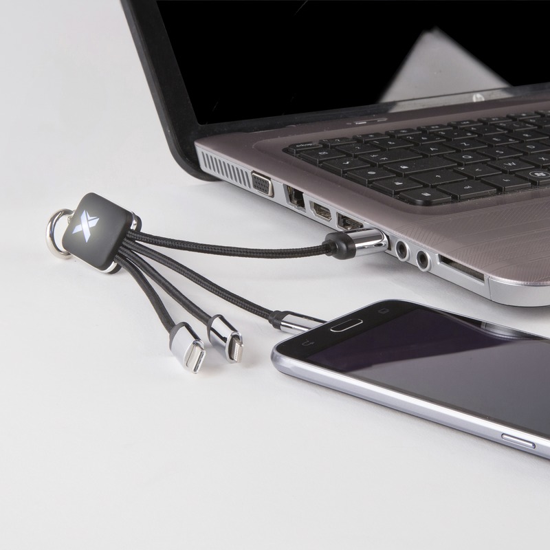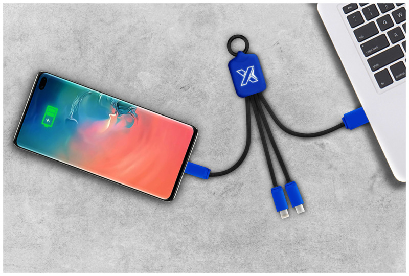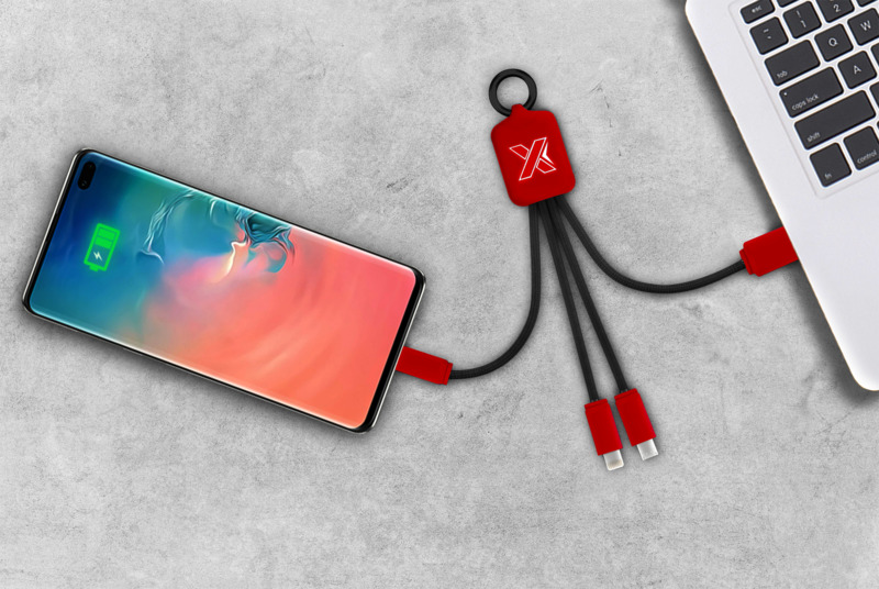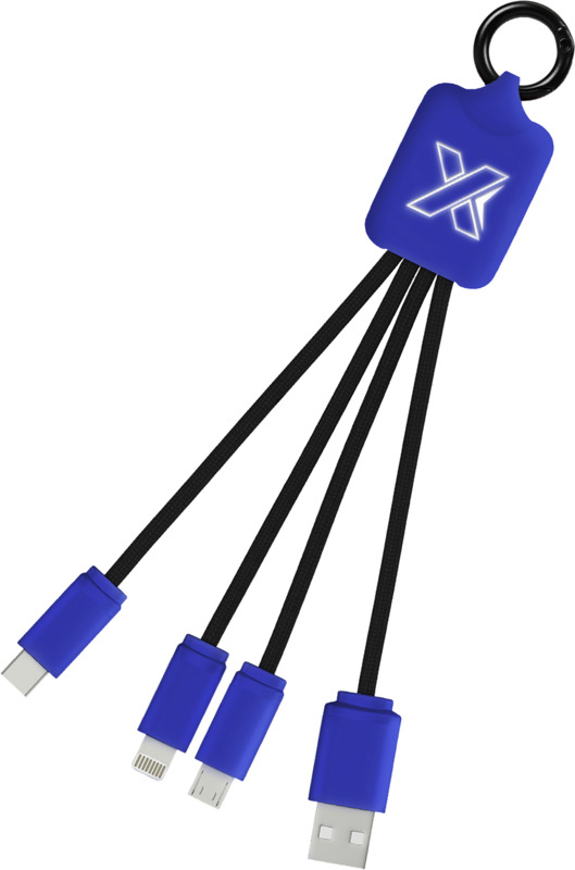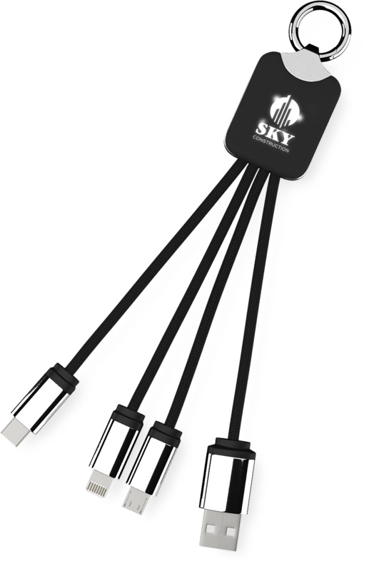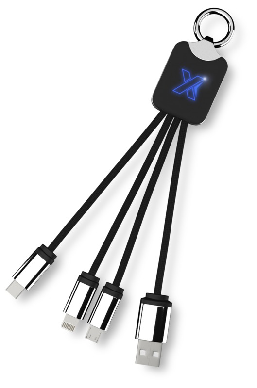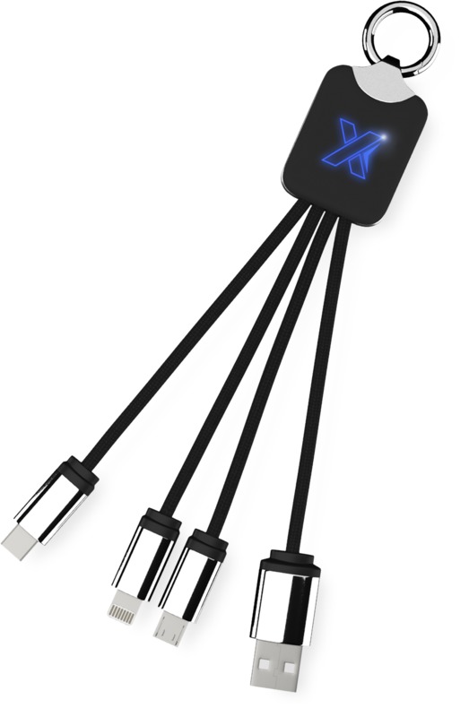 The SCX.design C15 quatro light-up cable offers practical utility as a promotional product for clients and staff. This multi-connector promotional cable makes charging various devices easy.