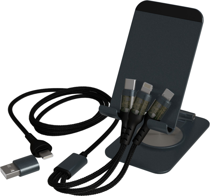 Keep phones upright and charged with the SCX.design O32 foldable stand. It rotates 360 degrees for various views and includes a 3-in-1 charging cable for Type-C, iPhone, and Micro USB devices. This makes it a practical item for any brand promotion.