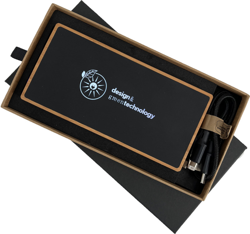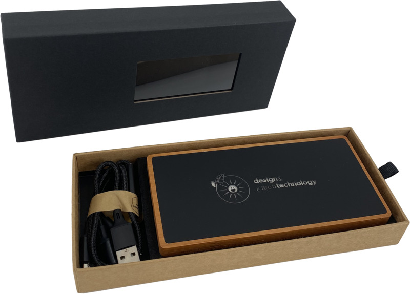 • The power bank measures 14.4 x 6.9 x 1.95 cm and is made from wood and soft touch recycled plastic.