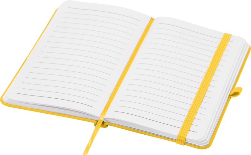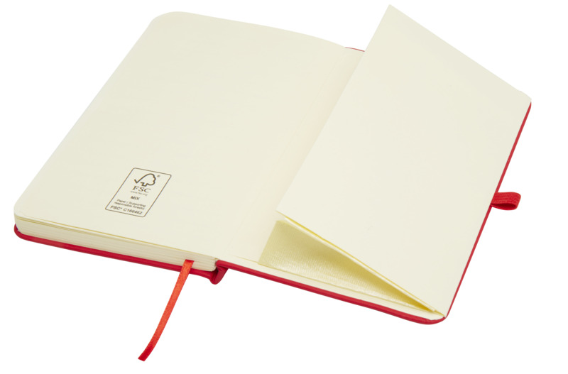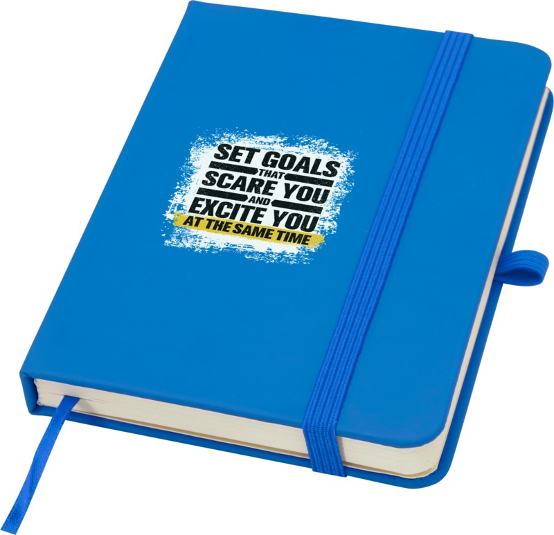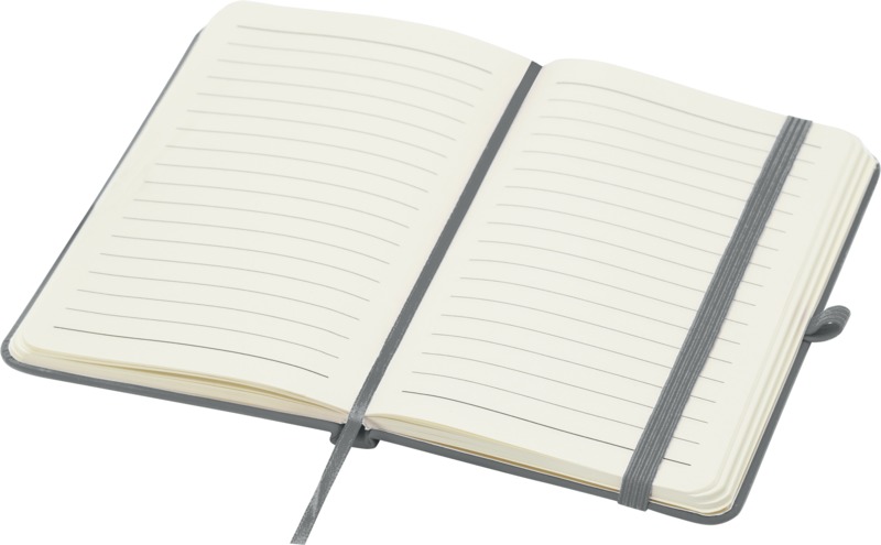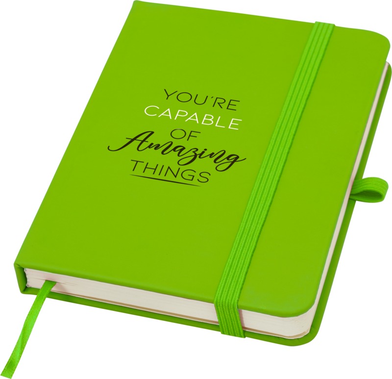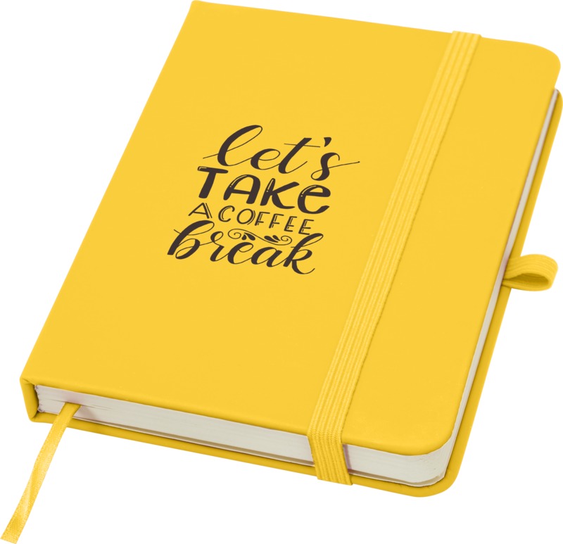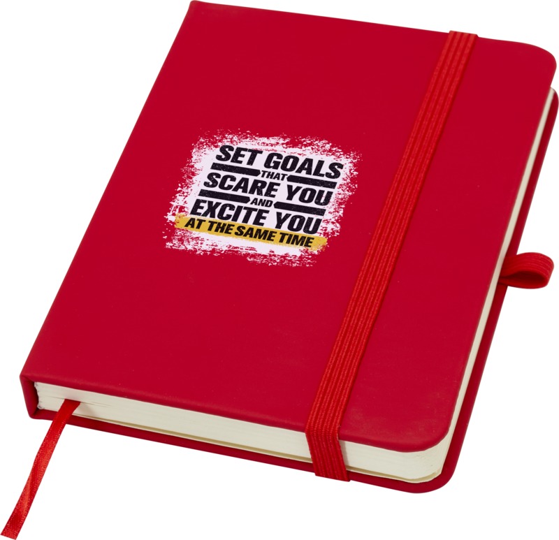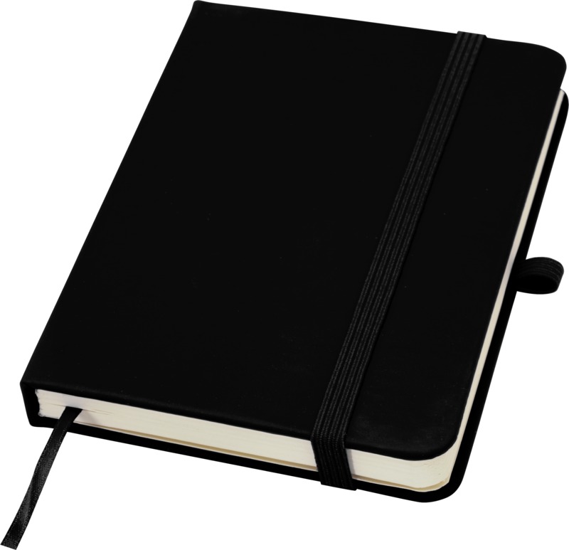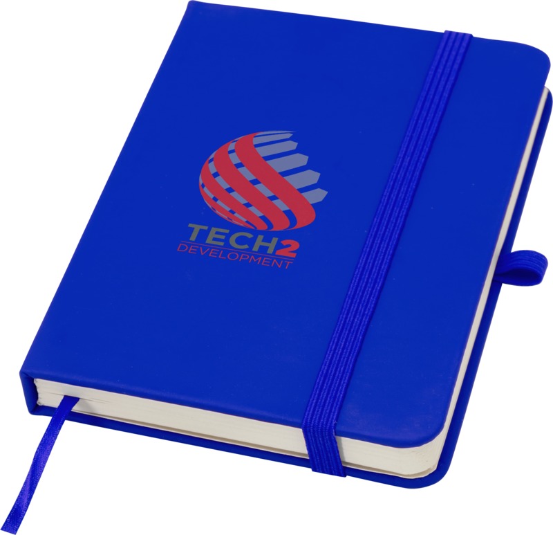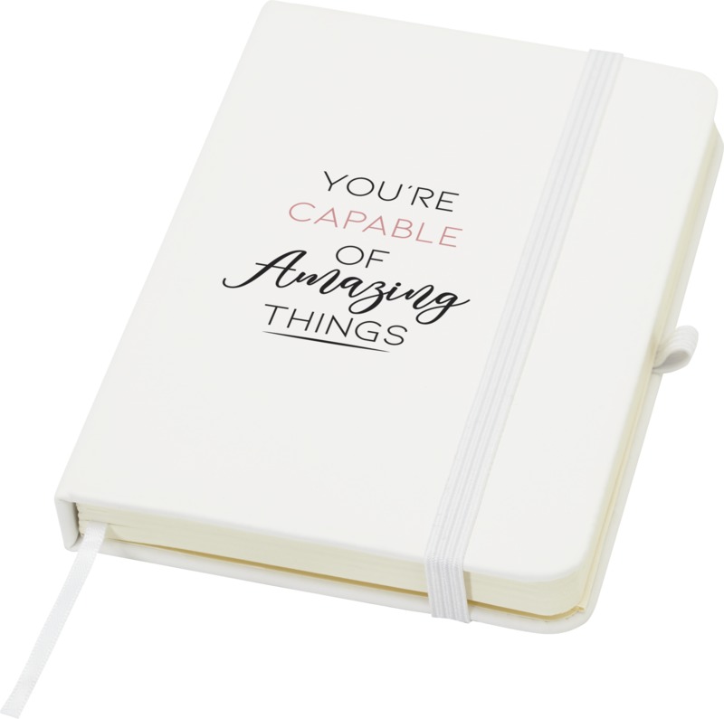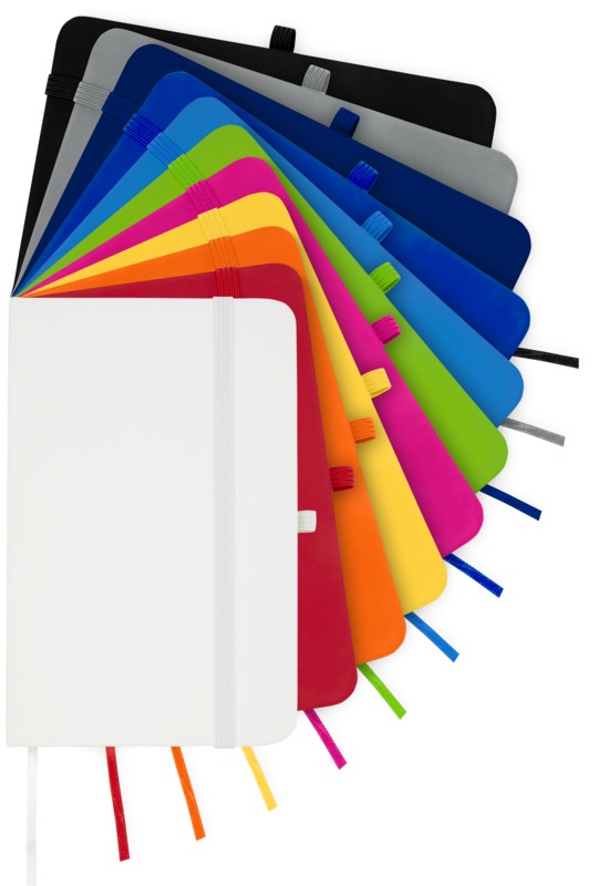Keep your brand visible with the Spectrum Plus A6 hard cover notebook. It features a soft-feel hard cover with a pen loop, elastic closure, and 80 lined cream sheets. This notebook is a practical item for general promotional use.