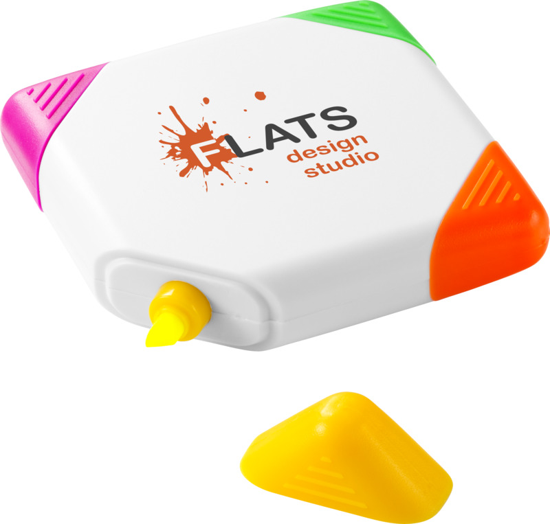 This compact Trafalgar square highlighter provides yellow, orange, pink, and green ink from one unit. Its chisel tip makes highlighting easy, saving space in any pencil case. It is a practical item for promoting your brand in offices or study settings.