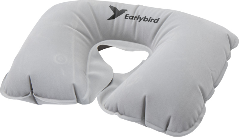 This Traveler inflatable pillow makes journeys more comfortable by providing neck support. It is compact and inflates simply, packing into a matching fabric pouch for easy transport. A practical promotional item for businesses.