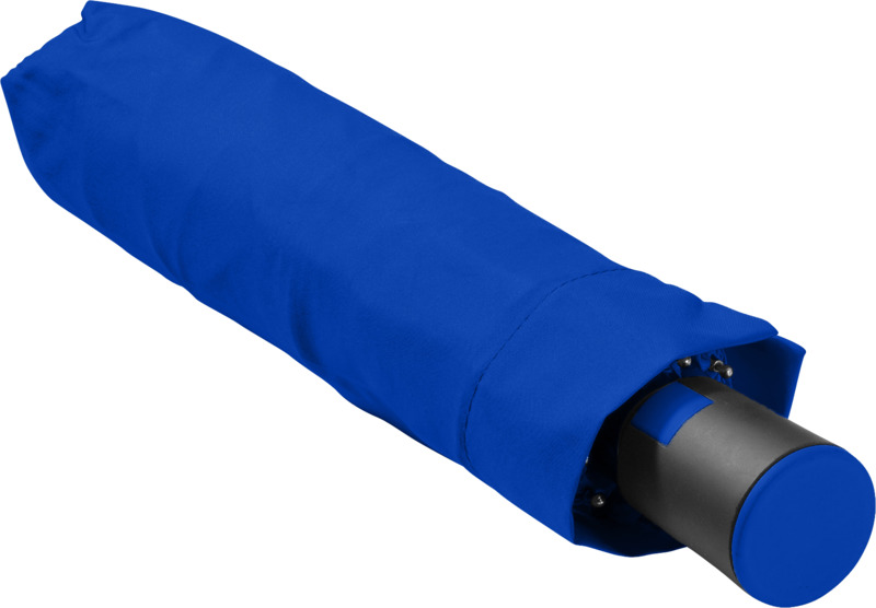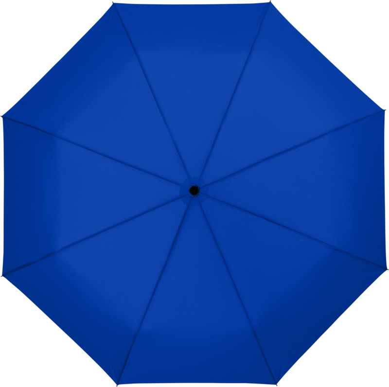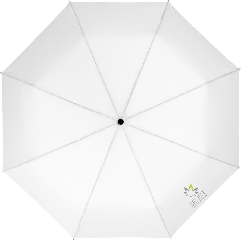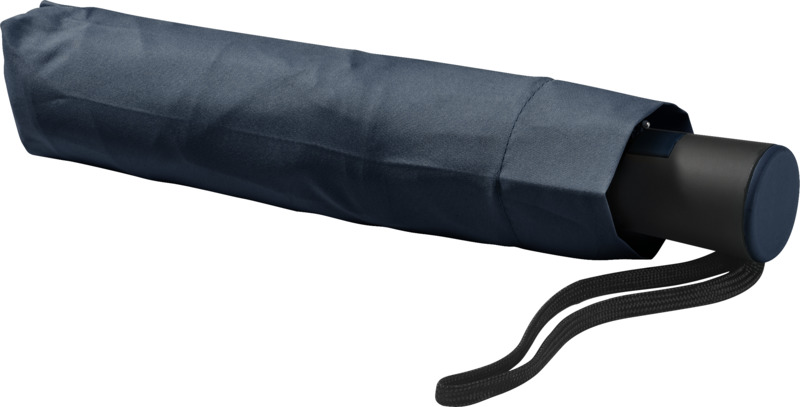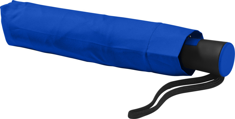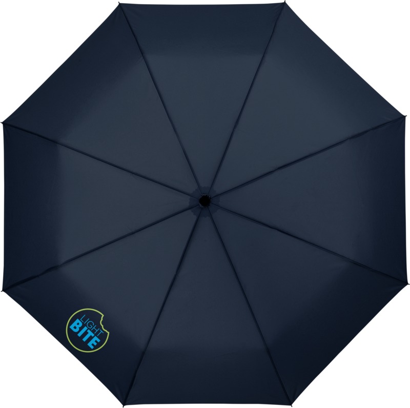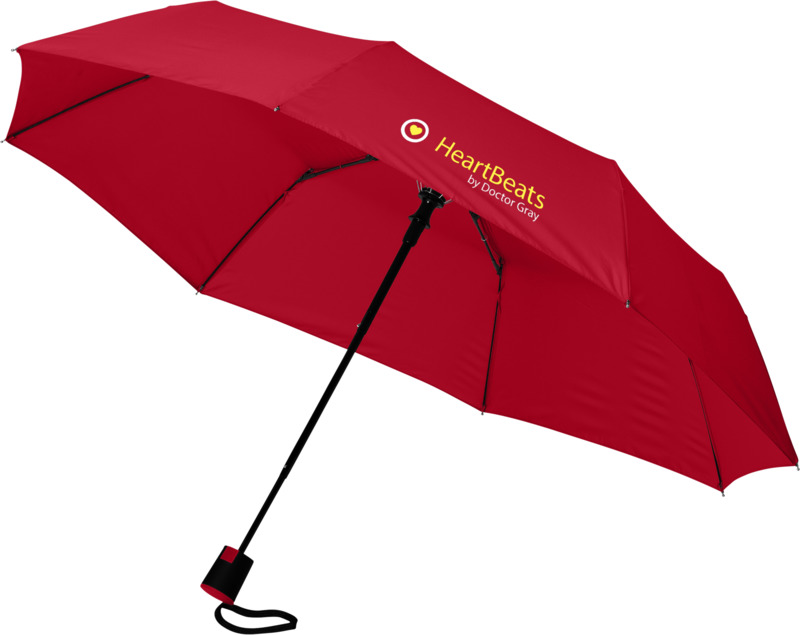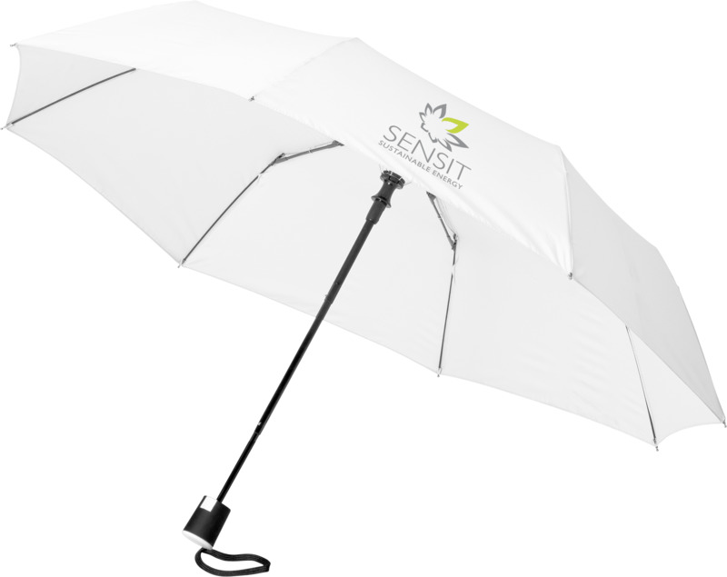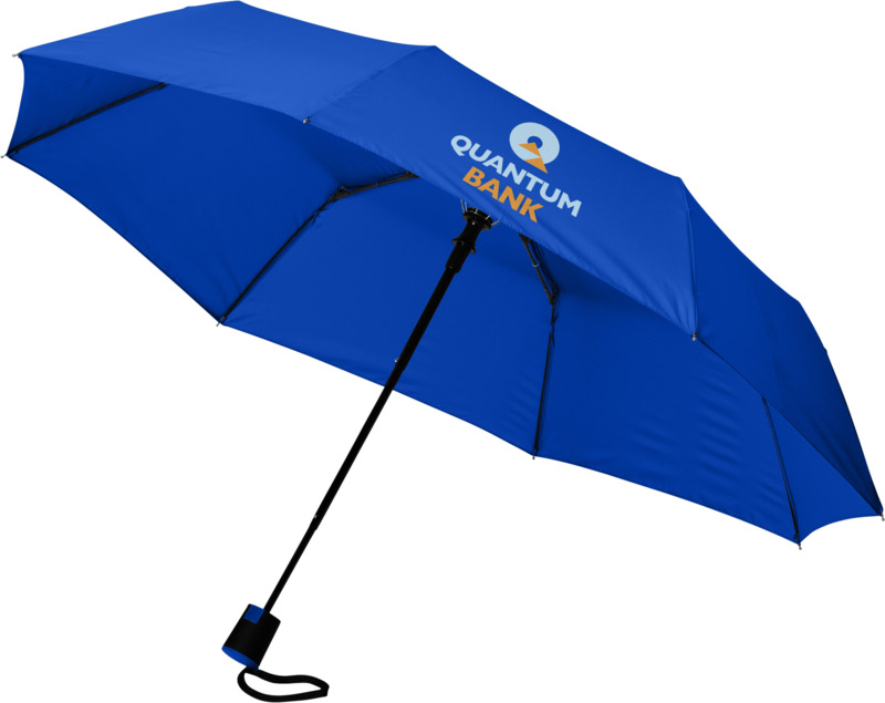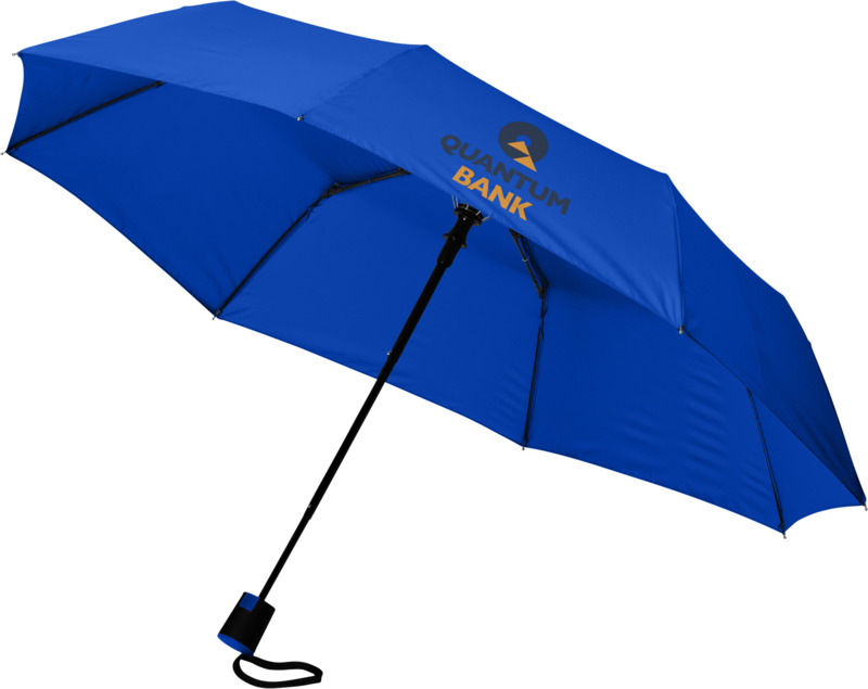 This Wali 21″ foldable auto-open umbrella offers practical brand visibility. It opens with one button and features a durable metal frame with fibreglass ribs. The compact design includes a protective pouch, making it a good promotional product for businesses.